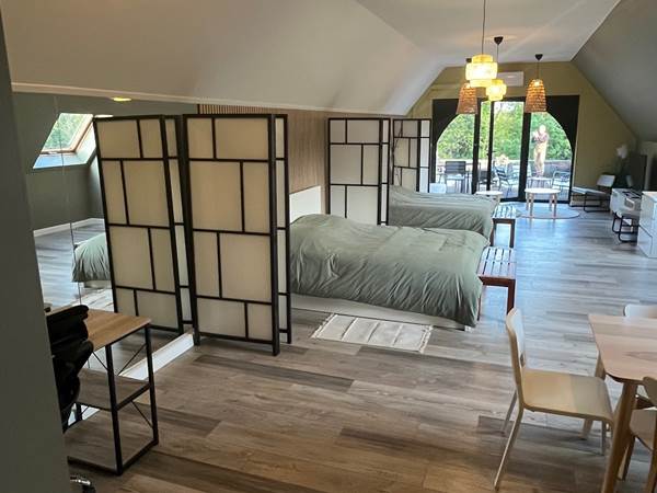 D'un lit double 160/200 (ATTENTION : pour l'accès à la chambre en mezzanine , l'escalier est assez raide et ne peut convenir aux personnes à mobilité réduite.)
